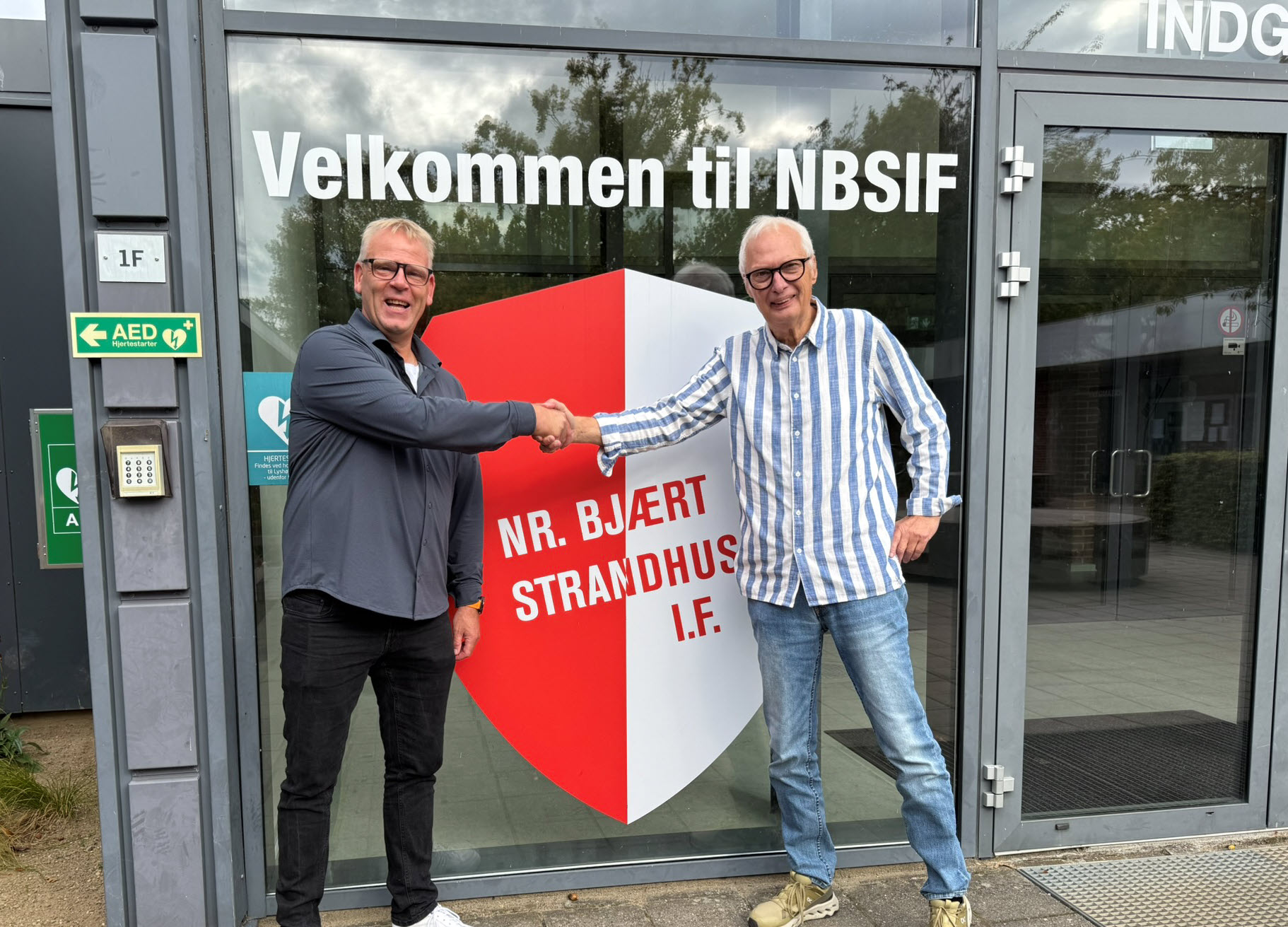 Velkommen til NBSIF! Formand for Nr. Bjært Strandhuse Idrætsforening Søren Nielsen (til højre) byder velkommen til foreningens første faste centerleder Morten Steen Nielsen, der tiltræder jobbet 1. november 2025. Foto: NBSIF Kommunikation.